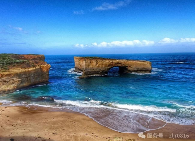 【倫敦?cái)鄻颉繌那斑@個(gè)巖石是突出海面與陸地連接的岬,由于海浪的侵蝕沖刷形成 2 個(gè)圓洞,正好成雙拱形,所以 起名為“倫敦橋”。在 1990 年 1 月 15 日的傍晚時(shí)分,與陸地連接的圓洞突然塌落,與大陸脫離形成的斷橋。大自 然的力量是巨大的,大自然塑造的景觀有一種人工無法比擬的神奇。